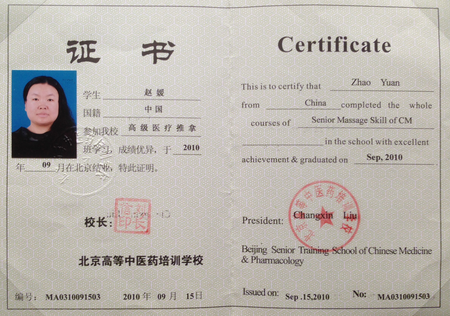 Anna came from China, she got her traditional Chinese massage therapists certificate from Beijing University of Chinese Medicine, Beijing China.